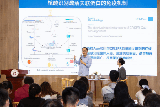 互动交流环节中,同学们围绕科研入门、技术转化、机制解析等方面踊跃提问。针对原核免疫机制的转化前景,韩文元介绍了基于效应蛋白COM BC与信号分子DIPTP的检测工具开发,以及非典型氨基酸研究带来的新启示。此外,韩文元还就细菌免疫系统机制解析的难点、课题推进策略及技术协作经验等话题与同学展开交流。