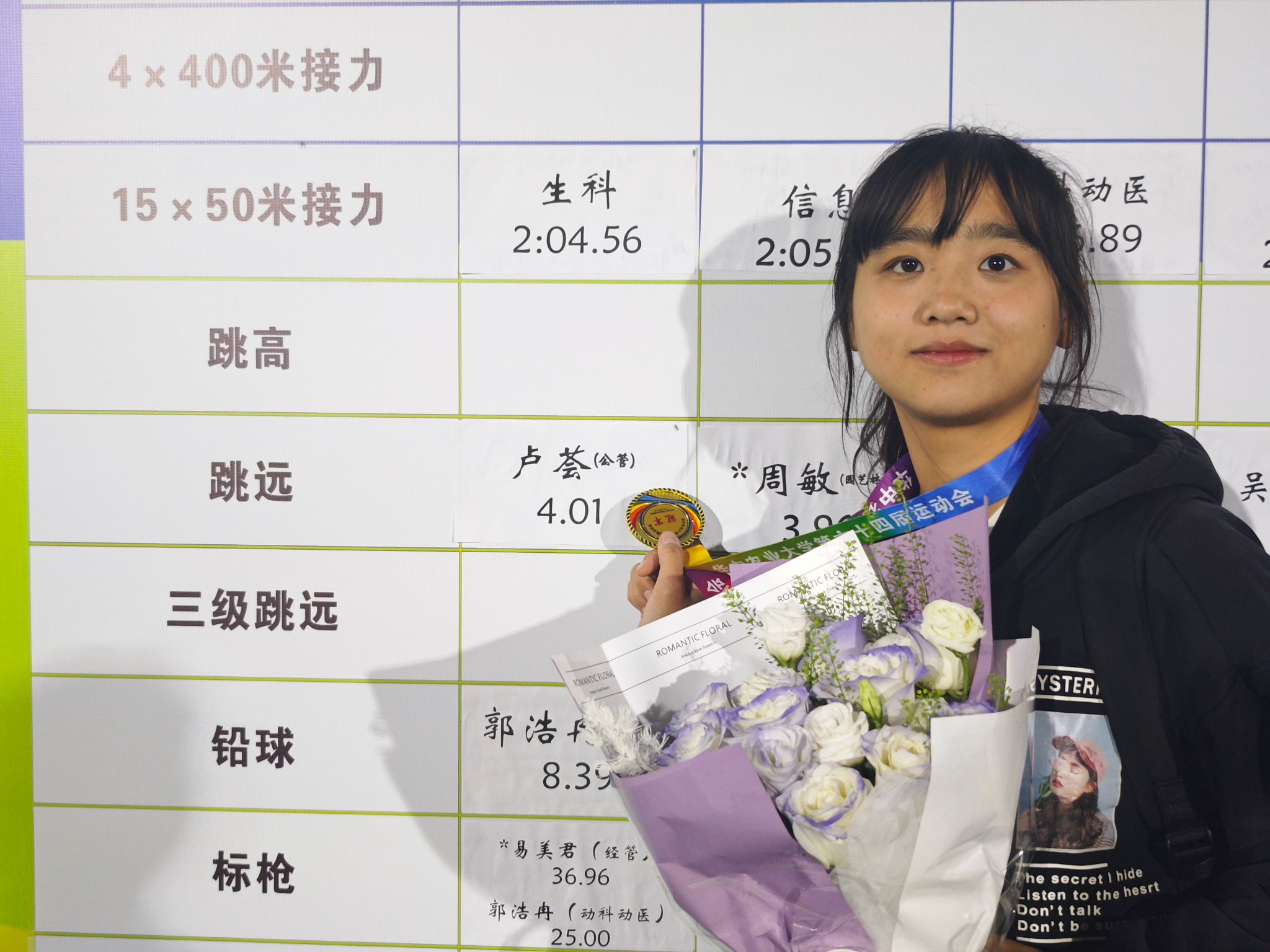 女子跳远冠军22级本科生卢荟赛后与金牌合影(卢荟 供图)