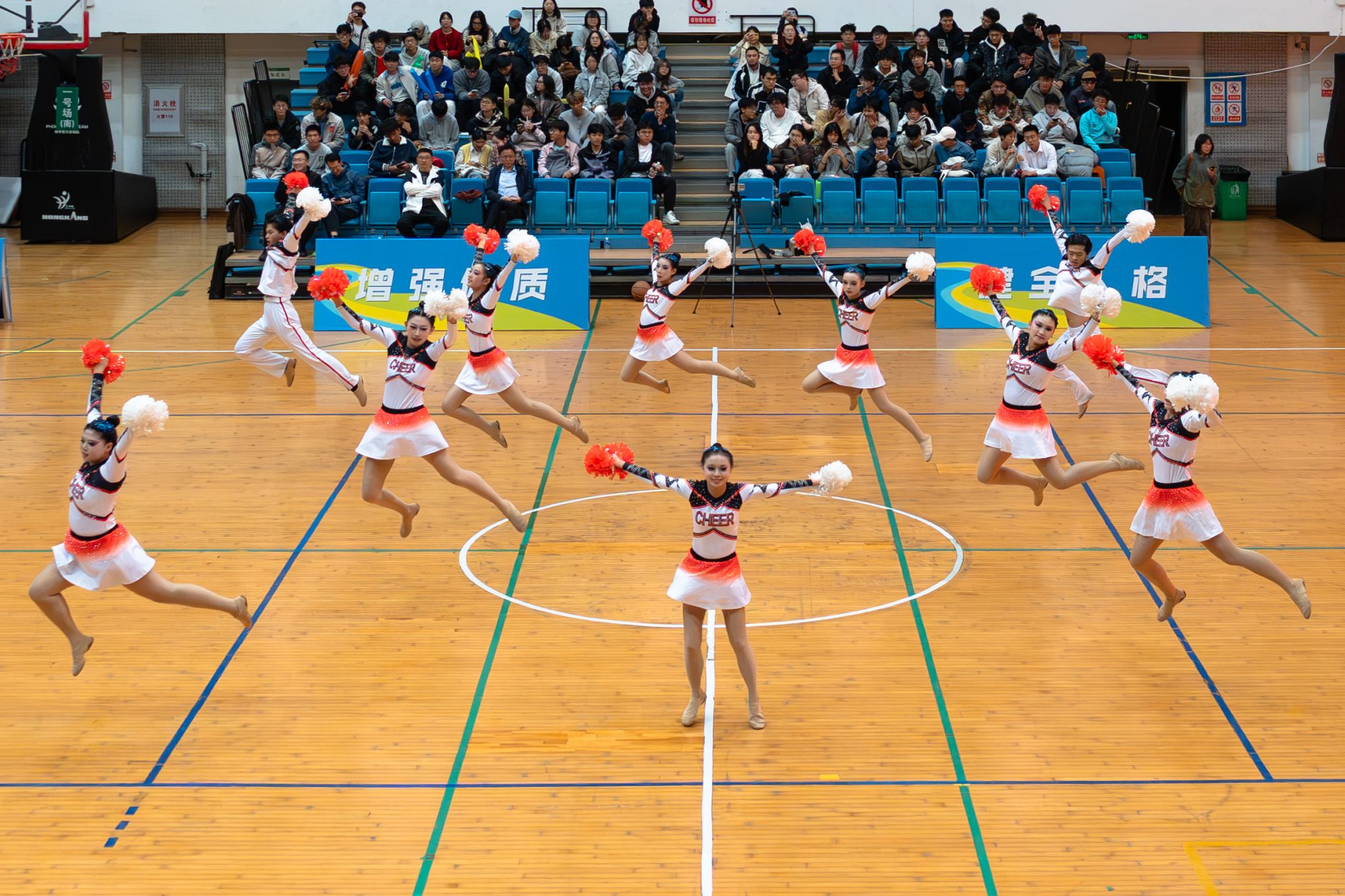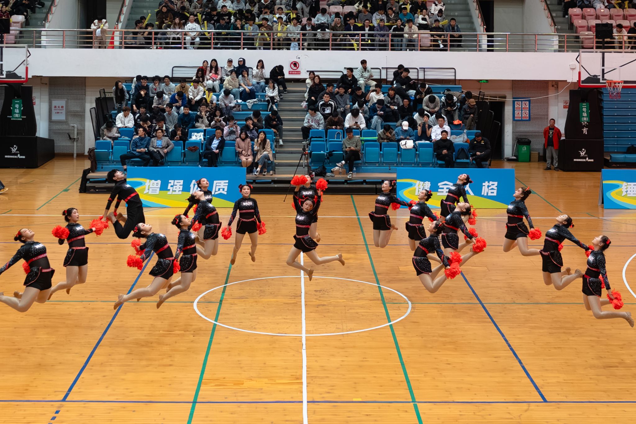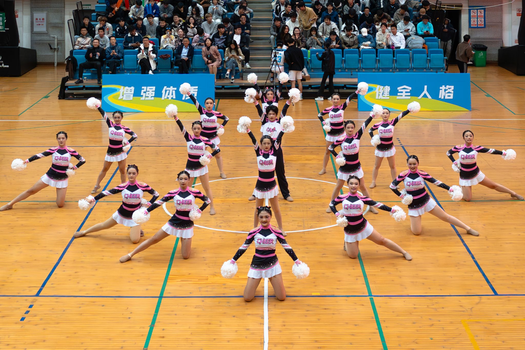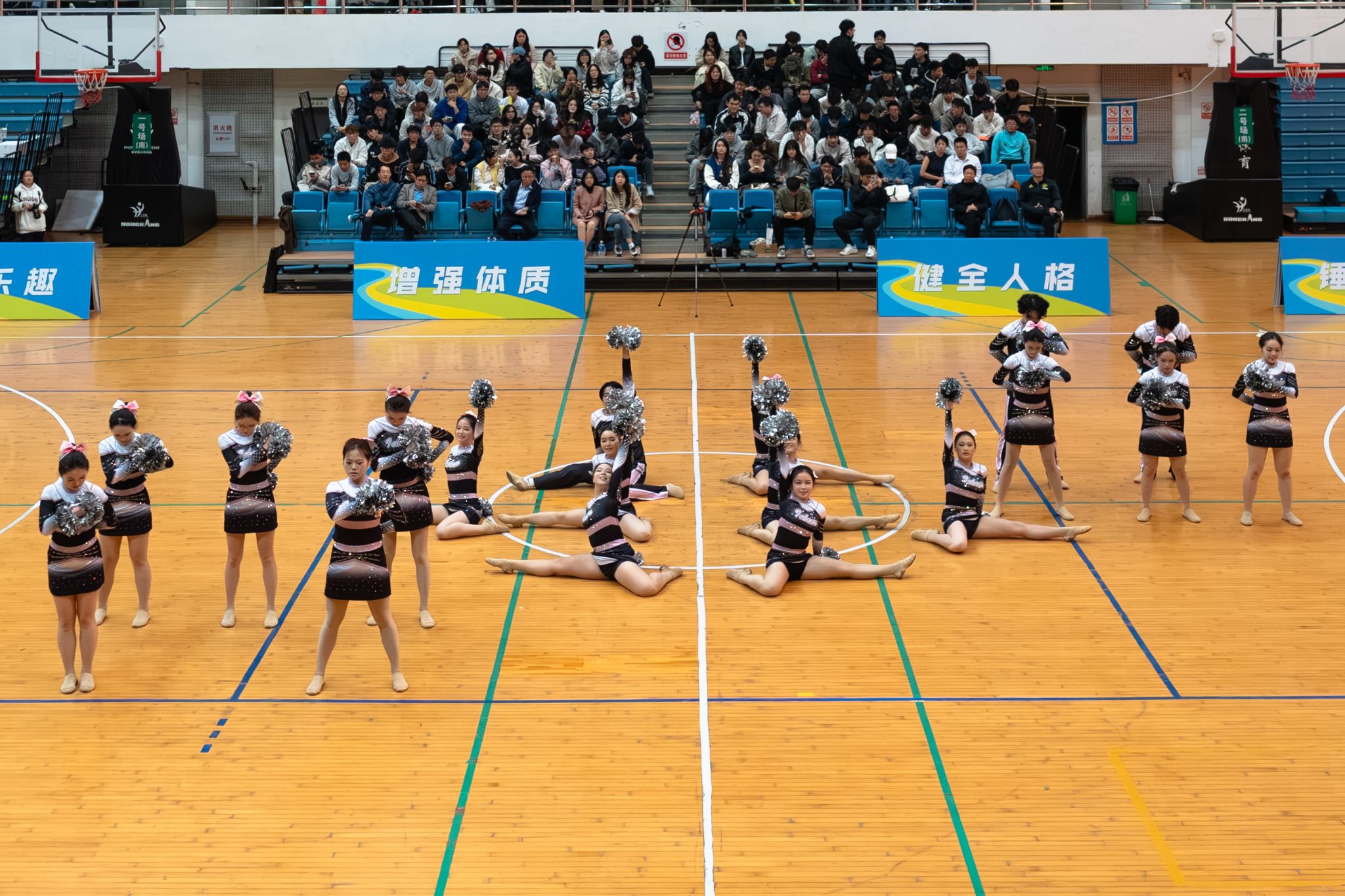 动物科学技术学院、动物医学院啦啦队紧随其后,以一个托举动作精彩开场。配合着劲爆的鼓点,她们在旋转中不断变换队形,却仍保持整齐。弯腰、起身、翻滚,她们从后向前动作波浪式传递,每一处衔接严密流畅,尽显默契协作,逐渐点燃场内热情,将气氛推向高潮。