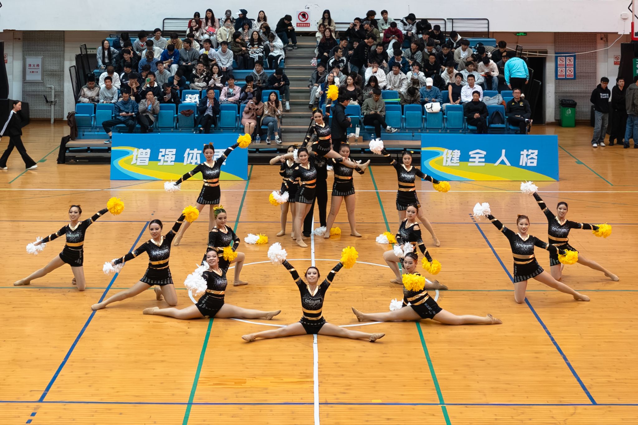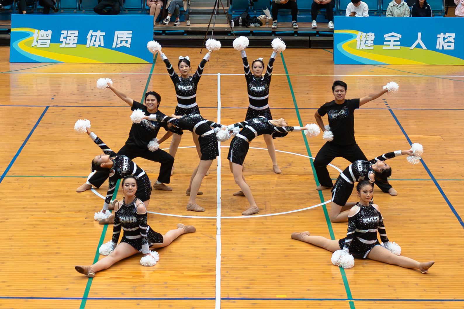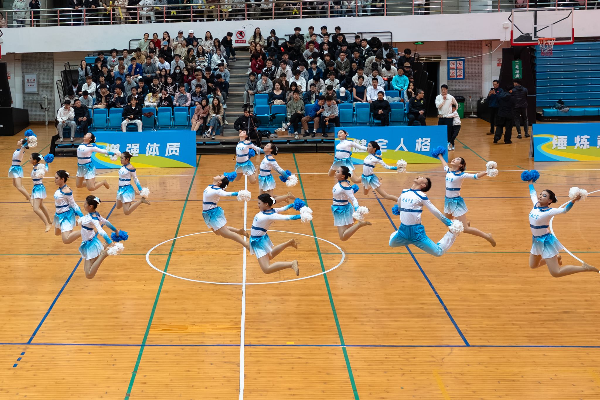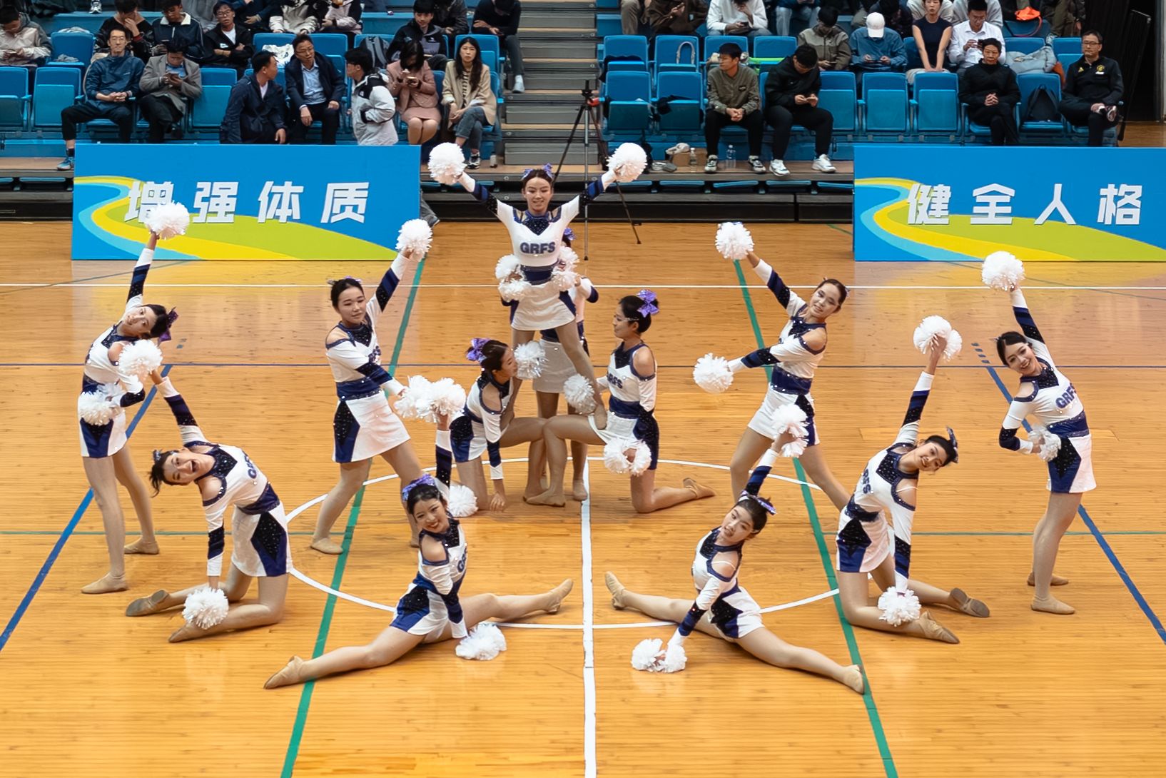工学院啦啦队继续这份热情,手捧蓝色花球,迈着矫健的步伐上场。伴随着激昂的鼓点,她们每一步都踏在节拍上,大跳、侧身翻、手举V型......每个动作她们都力争做到整齐划一。随后的一字马、高抬膝、劈叉跳等高难度动作更是引得全场欢呼,以极强的视觉冲击力为决赛画上圆满句号。