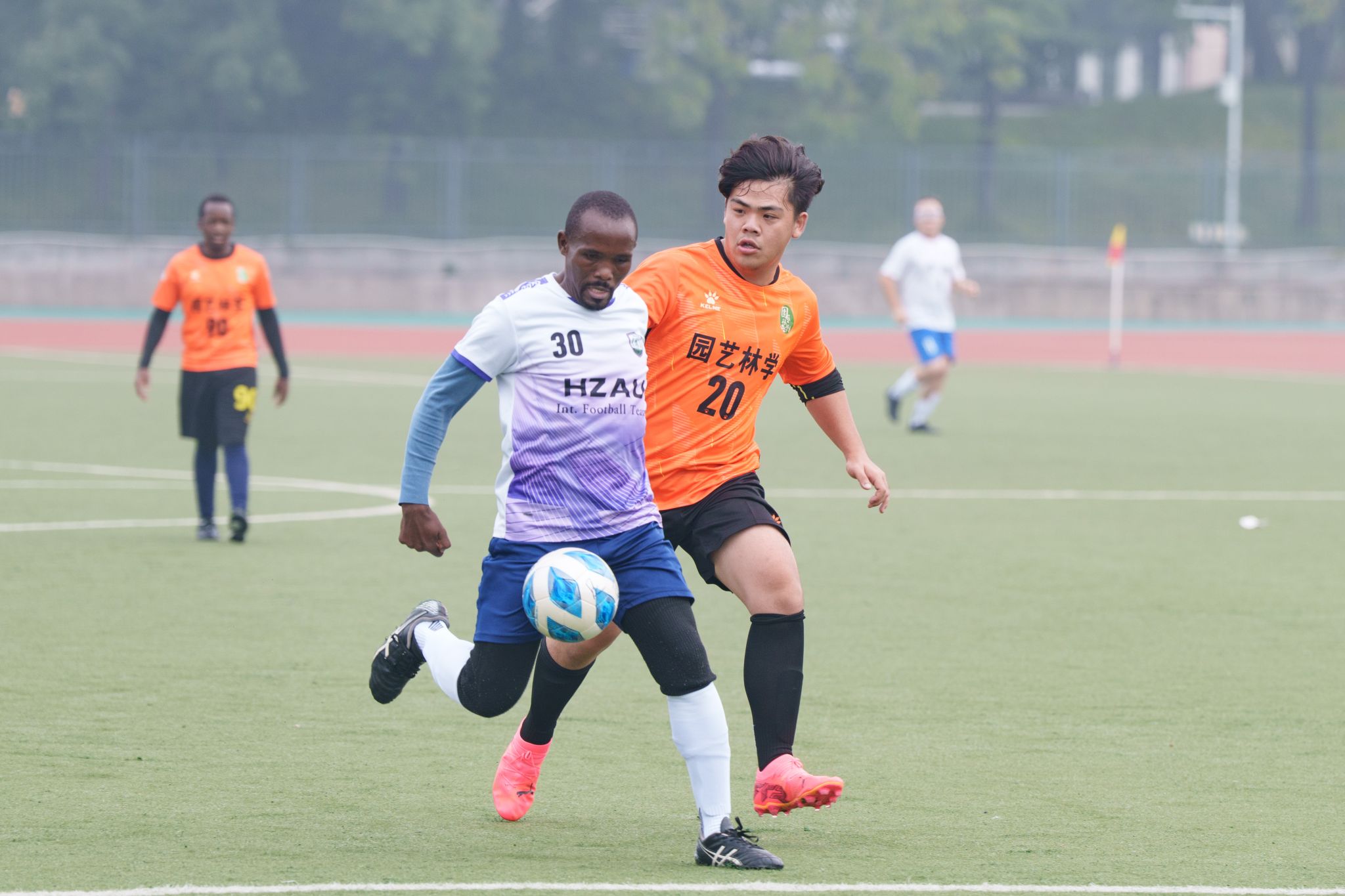再度回到同一水平线的双方大举进攻,比赛一度呈现白热化态势。第37分钟,足球传至禁区前沿,园艺林学学院23号孟庆放本想解围来球,却因触球点偏离预期位置,在慌乱中踢出一记乌龙球,2:1,资源与环境学院比分领先。