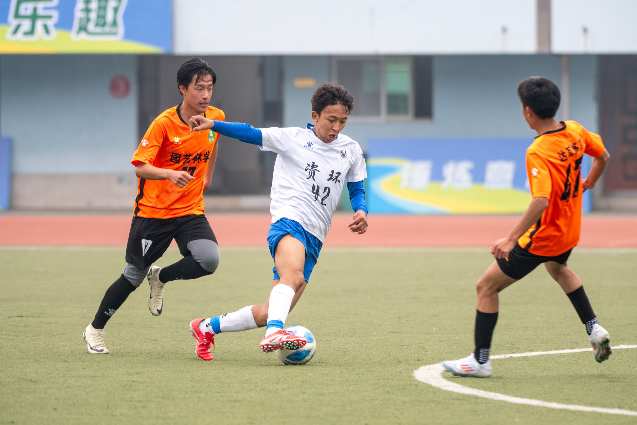 伤停补时阶段,双方胶着对抗,你来我往,攻防拉扯不断。随着终场哨声划破赛场,资源与环境学院4:2战胜园艺林学学院。