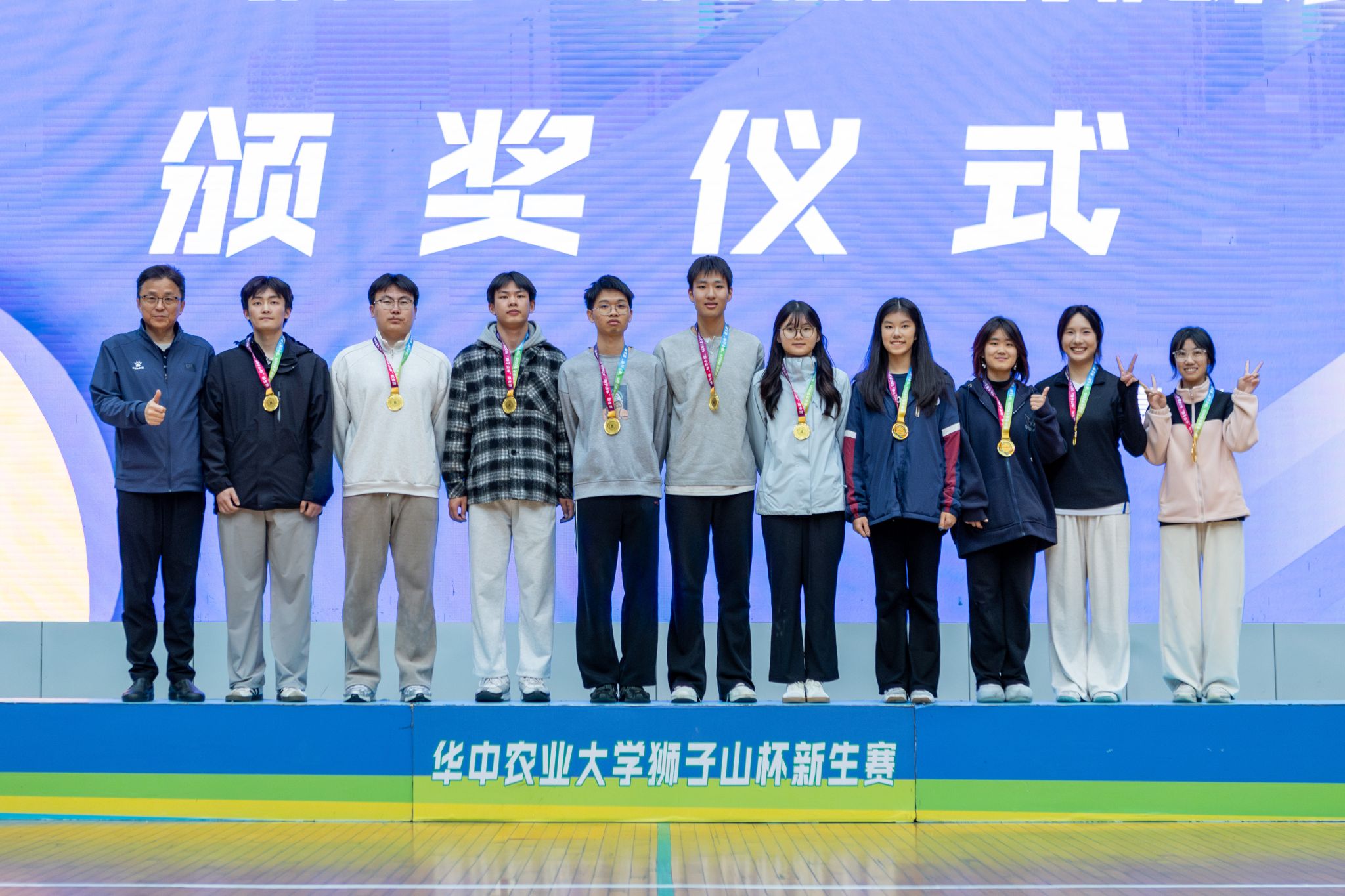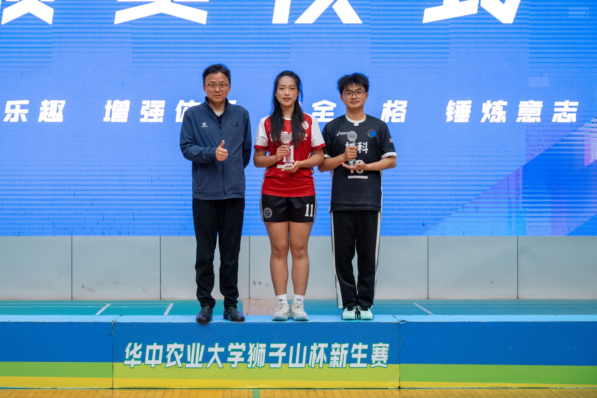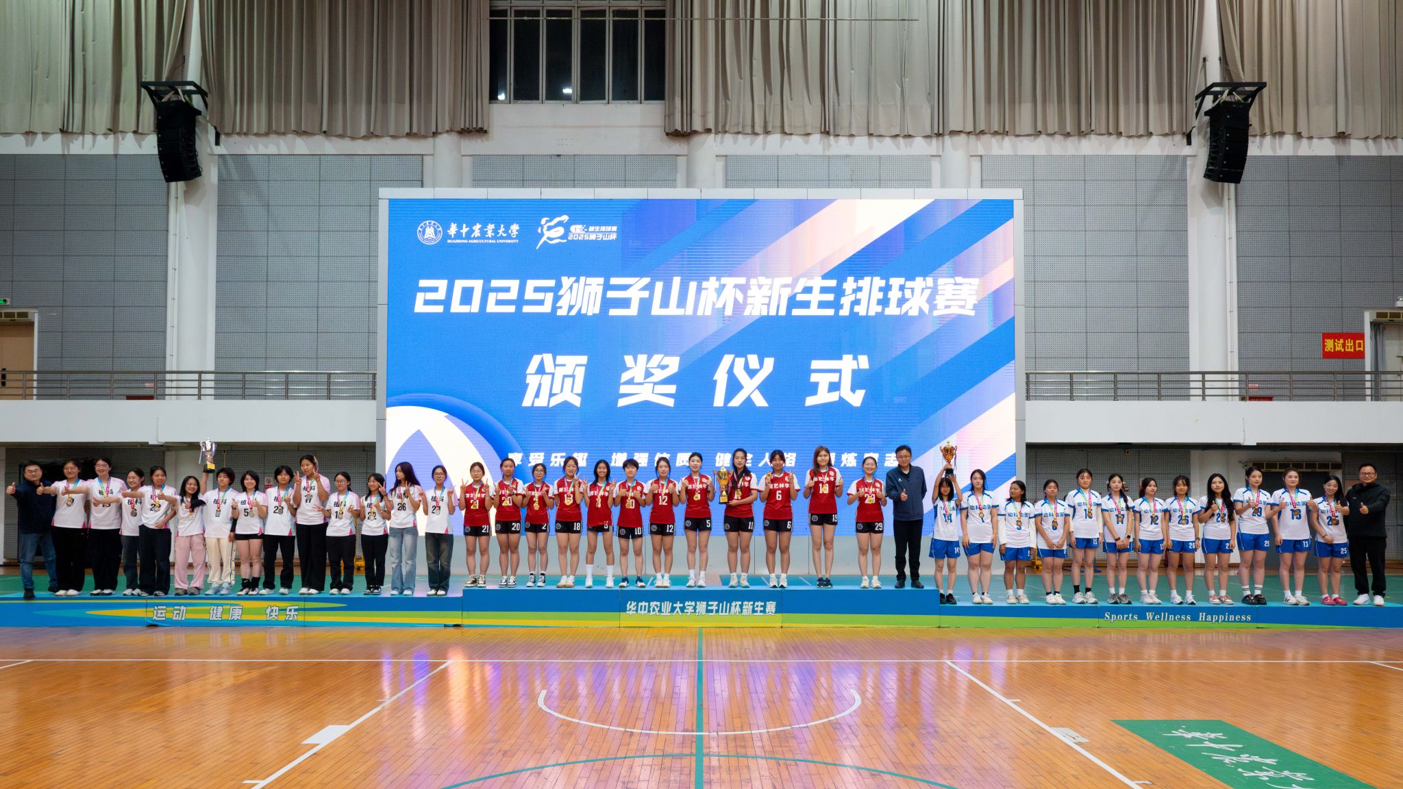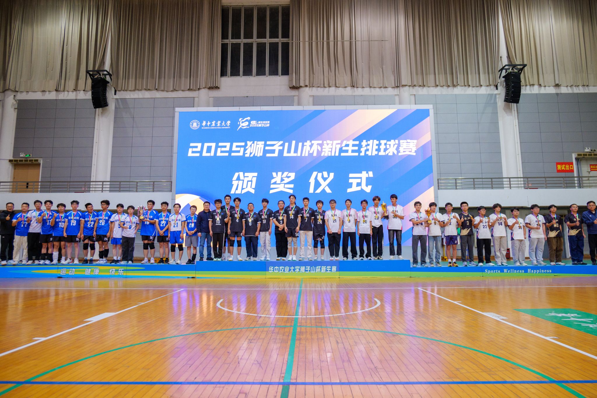 赛后举行颁奖仪式,体育部朱斌老师宣读了2025年“狮子山杯”新生排球赛比赛结果。动物科学技术学院、动物医学院党委书记刘兴斌老师,植物科学技术学院党委书记周雄老师,体育部党总支书记、主任陈国顺老师, 分别为男、女子组前三名的学院颁奖,并合影留念。