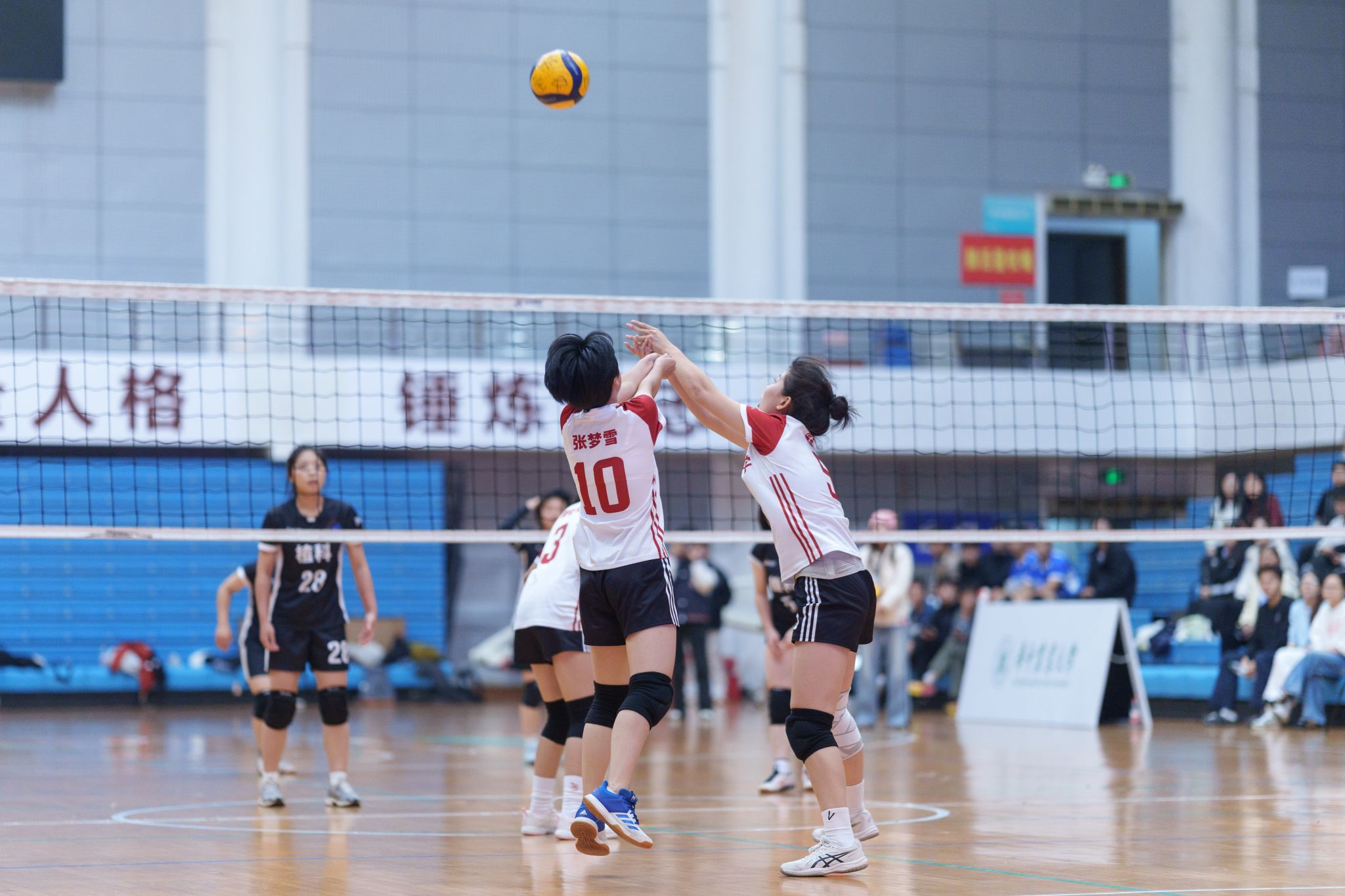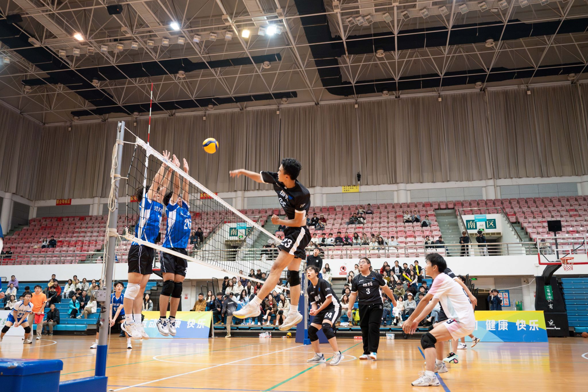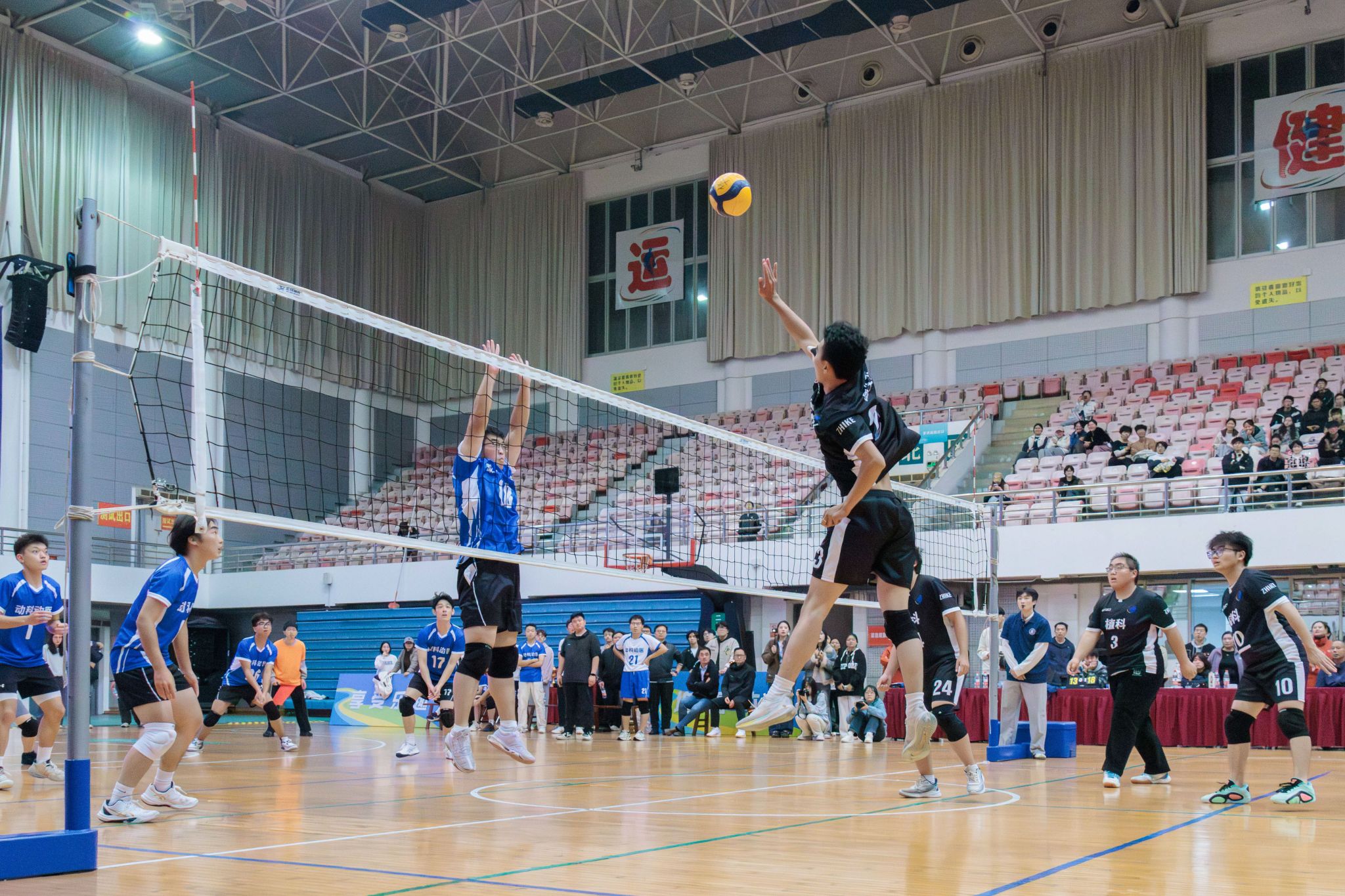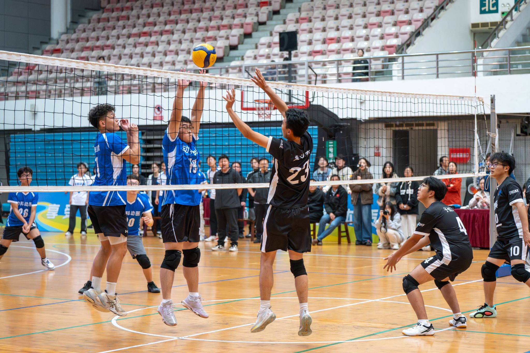动物科学技术学院、动物医学院男排队员拦网(学通社记者 卢悦悦 摄)