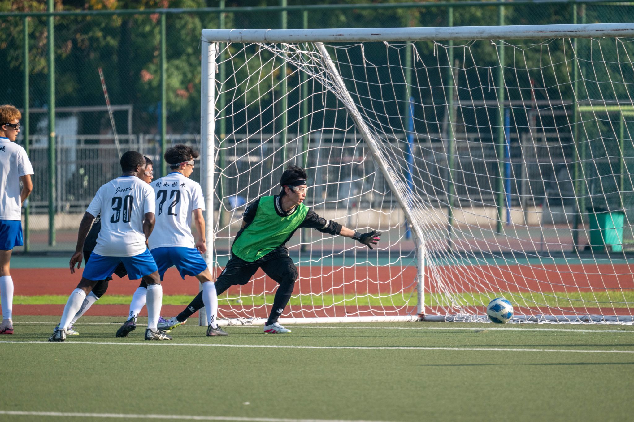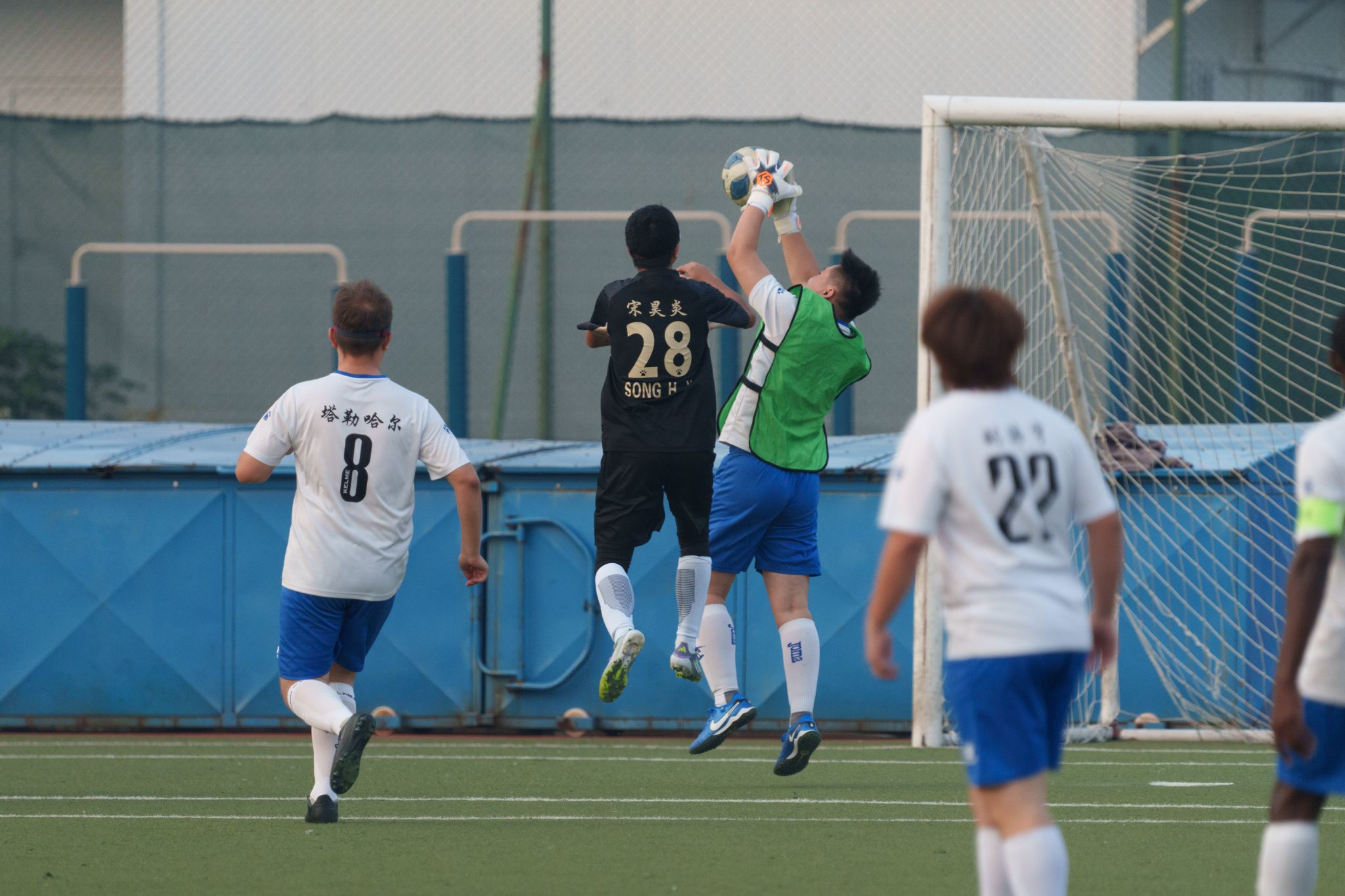 ▲资环学院门将将球牢牢摘下(学通社记者 刘博文 摄)