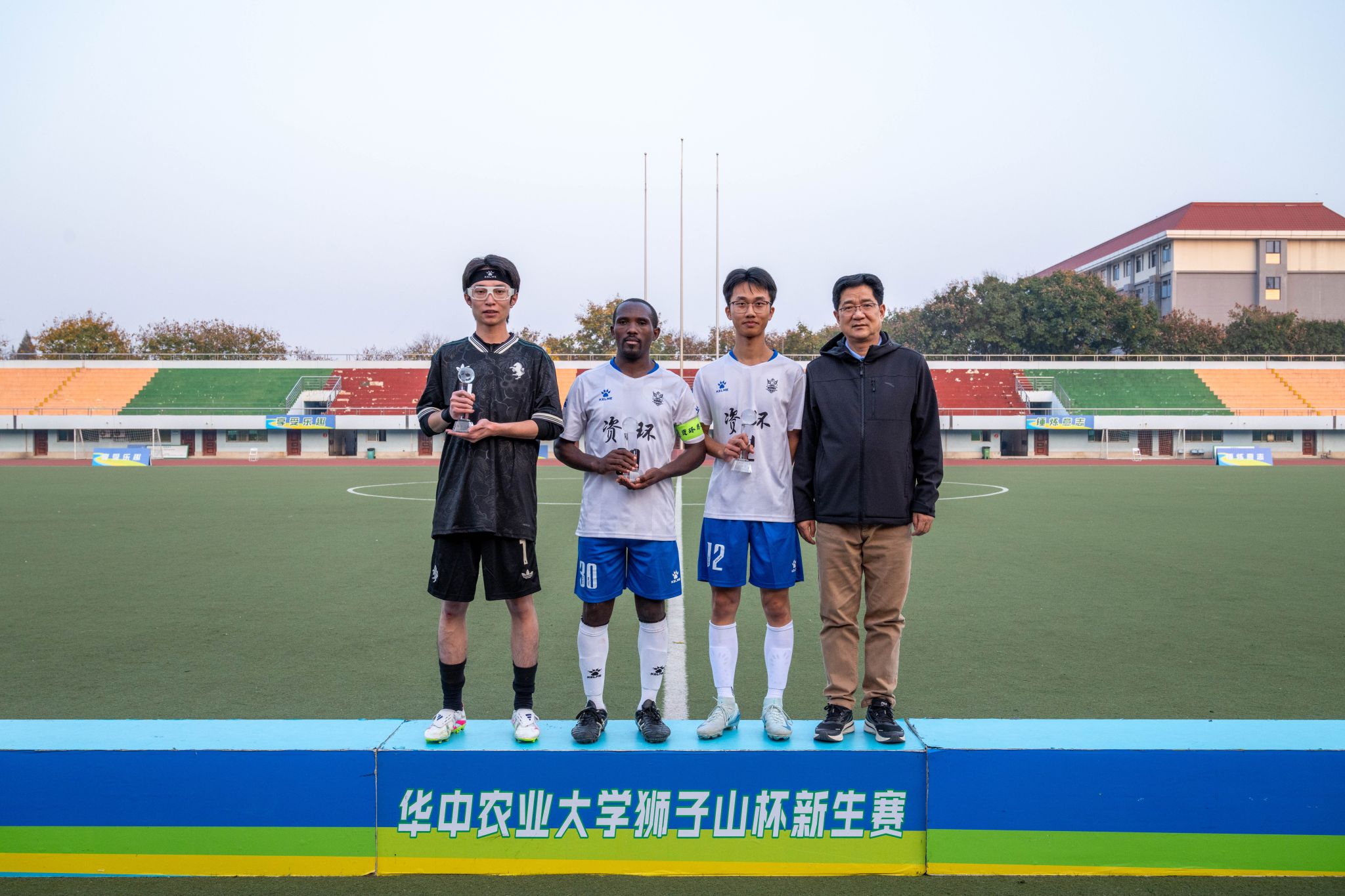 ▲校党委常委李向东为2025“狮子山杯”新生足球赛男子组单项奖获得者颁奖并合影留念(学通社记者 王文硕 摄)