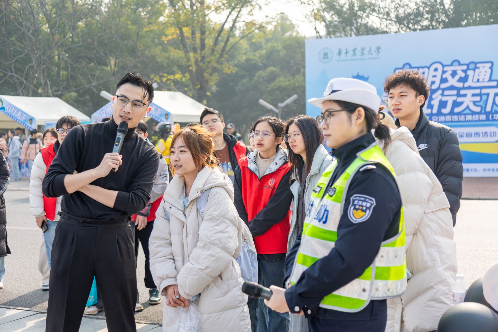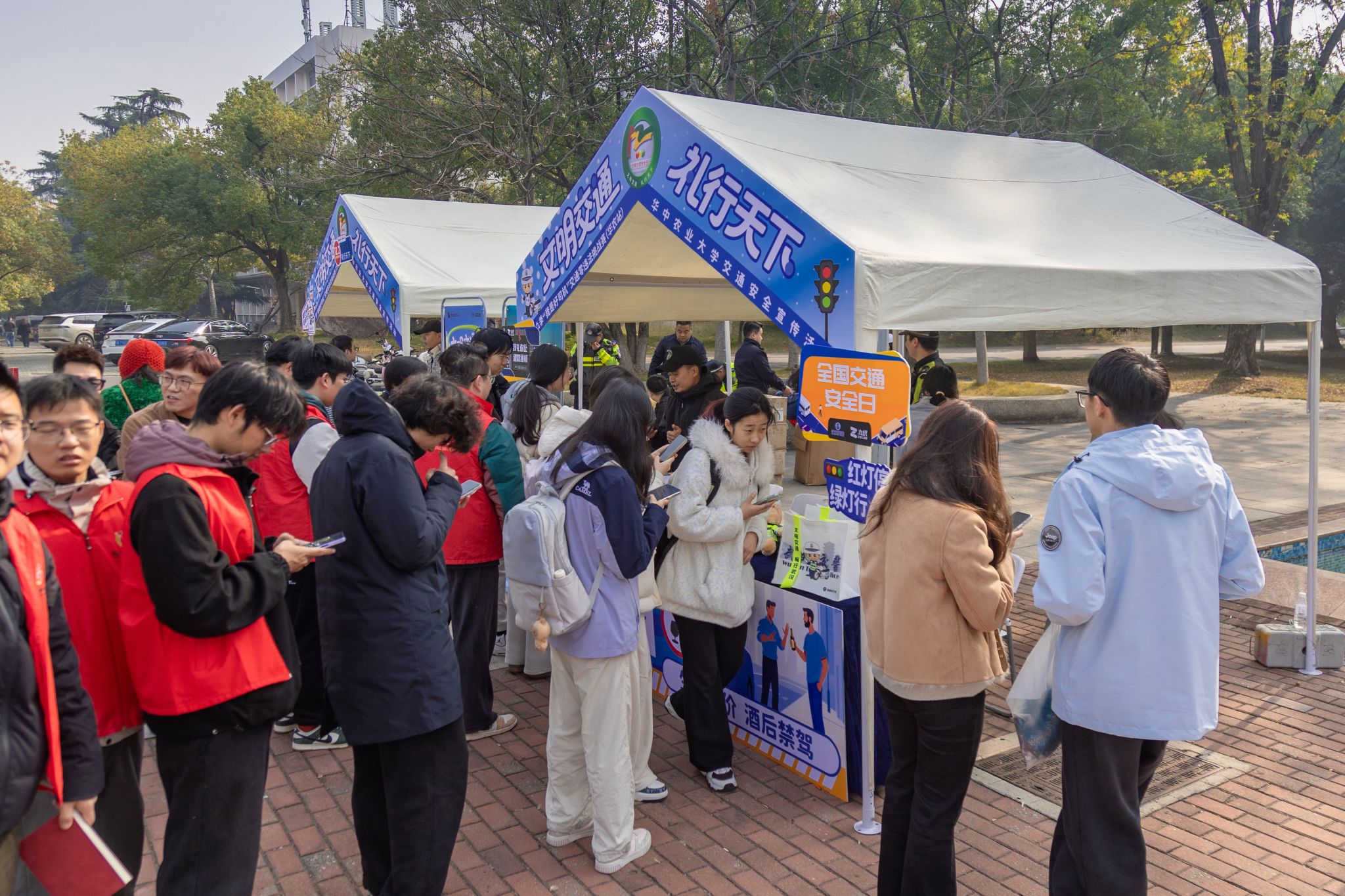 上午十点,狮子山广场热闹非凡,师生们踊跃参与,现场气氛热烈。本次活动设置交通文化展示、汉警快骑互动打卡、交通知识有奖问答、酒驾模拟体验、电动车牌照现场办理等多个特色板块,集宣传、服务、体验于一体。
