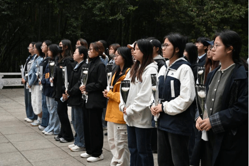 松柏常青,丰碑巍巍,烈士陵园内庄严肃穆。园内项英烈士的全身铜像巍然矗立,纪念碑上“项英烈士浩气长存”题字苍劲有力。在铜像前,学员们瞻仰追忆,献上白菊以祭英雄之魂。“项英是早期革命家,领导南方游击战争,创建和领导新四军,后在皖南事变中牺牲。”在校青马班七期学员、文法学院社会工作2402班金杨希同学的讲解下,全体学员回顾前辈的革命生平,静默致敬,表达对英烈的无限哀思和崇高敬意。