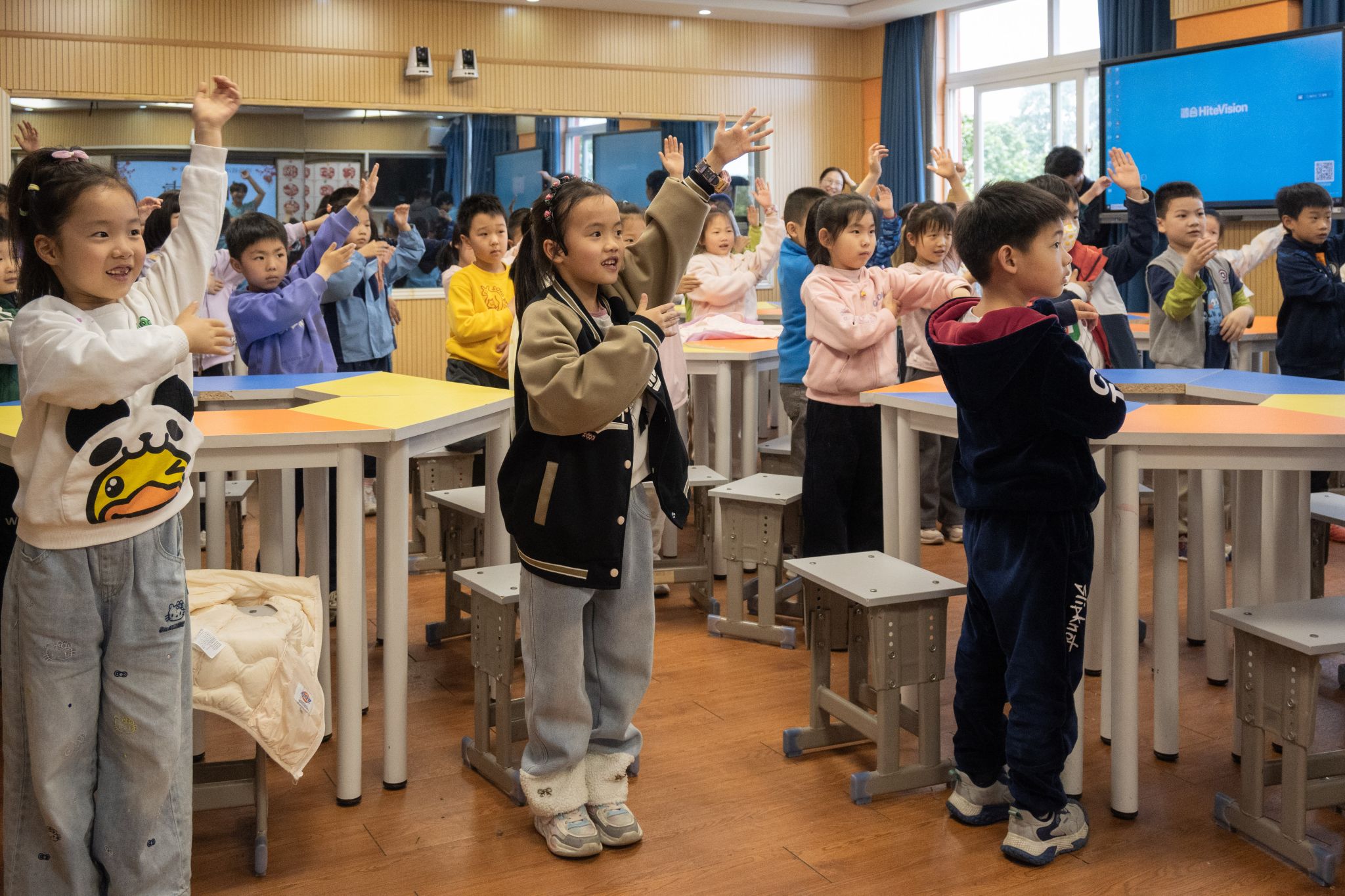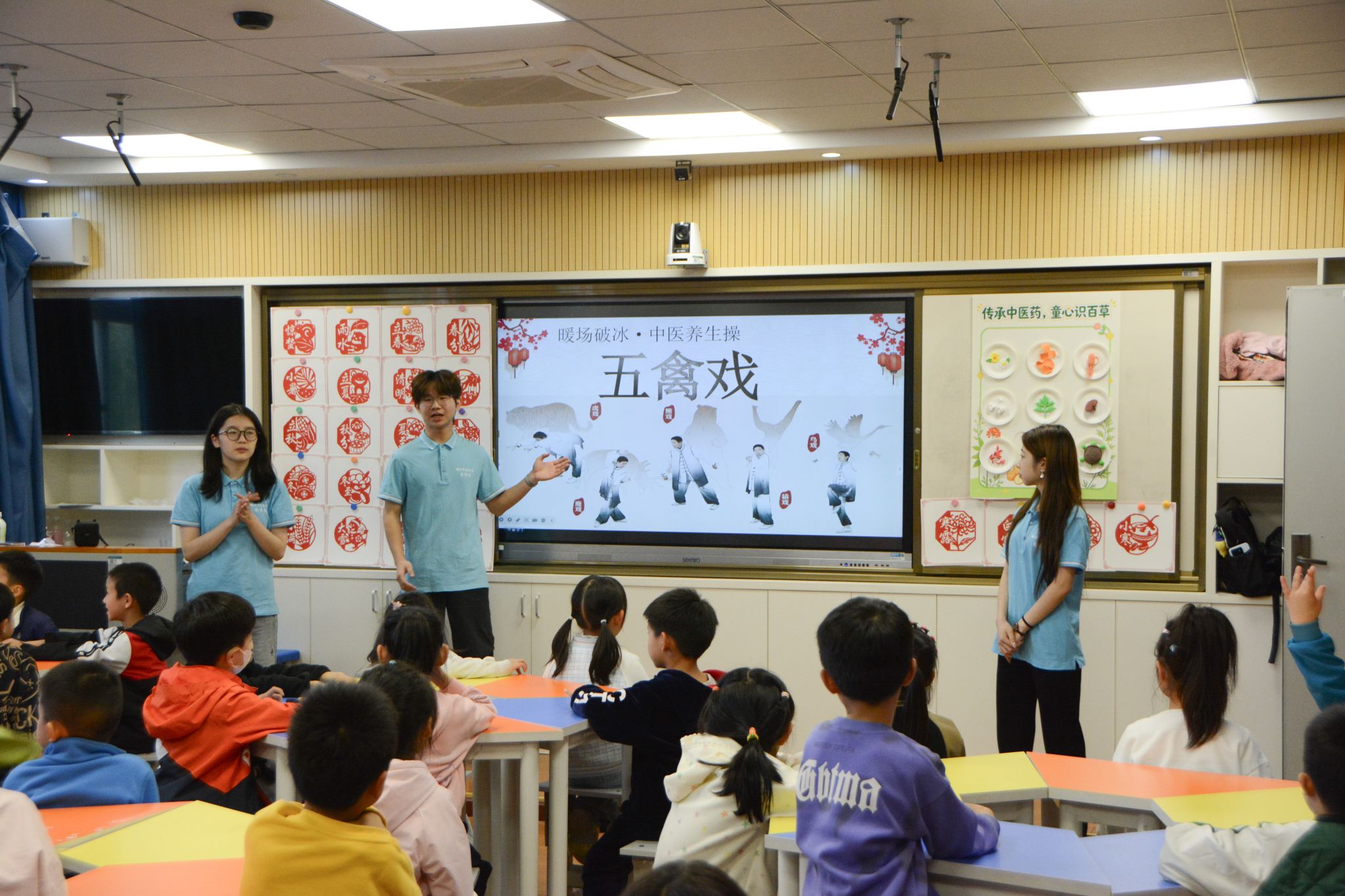 活动伊始,志愿者们以传统养生文化为切入点,带领孩子们练习“拍八虚”养生操,并分步教学简化版“五禽戏”。在志愿者的引导下,孩子们惟妙惟肖地模仿虎、鹿、熊、猿、鸟五种动物的动作与神态,于欢声笑语中强健体魄,切身感受传统导引术的独特魅力。