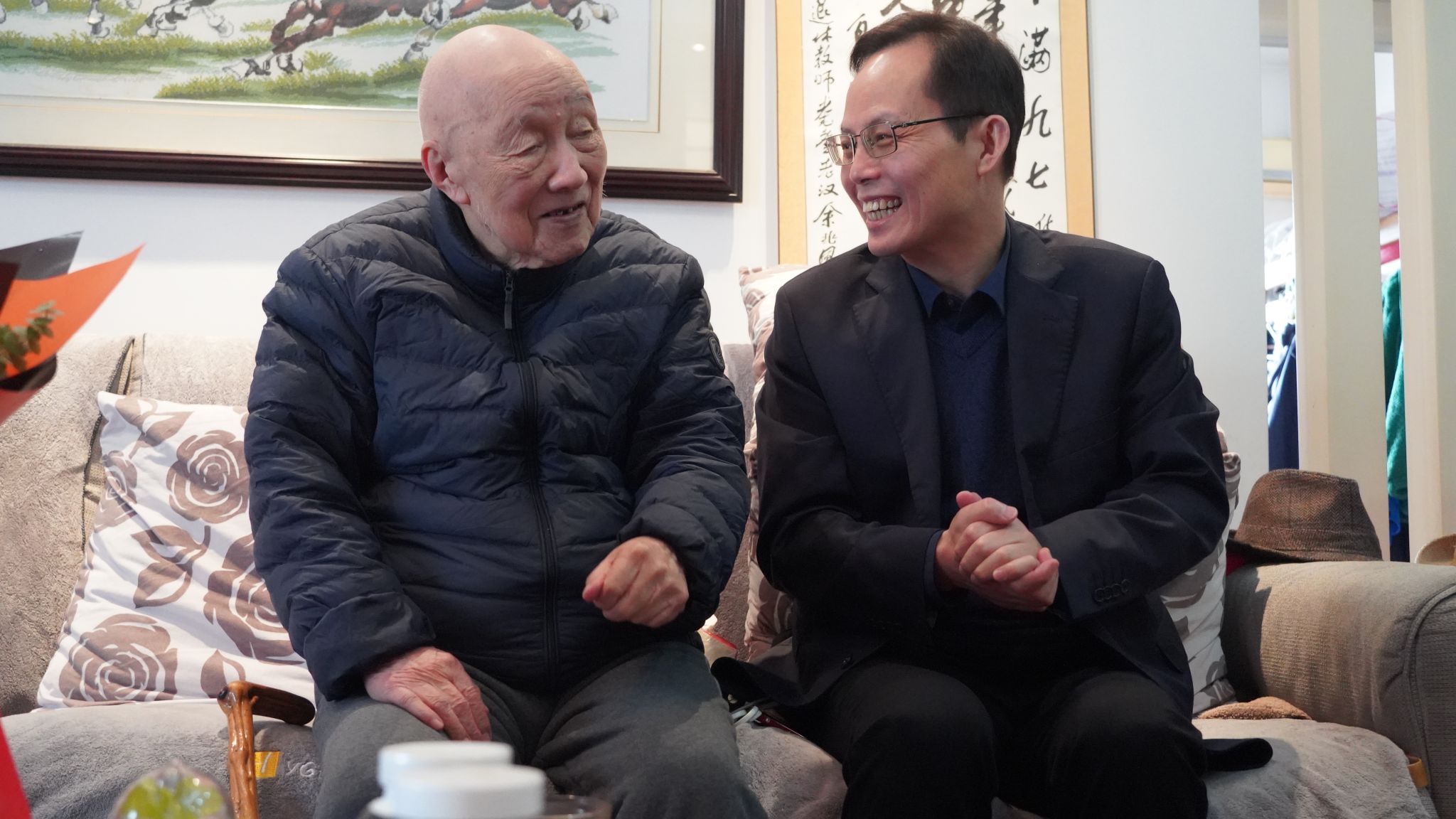 在余兆凤老师家里,杨少波深情回顾了自己学生时代受教于余老师的情景,代表学校感谢余老师为学校人才培养和事业发展辛勤耕耘、无私奉献,感谢余老师1990年退休至今仍然关心、支持学校和学院发展。杨少波详细了解余兆凤老师的身体健康、生活状况和家庭情况,对其家人悉心照护表示感谢,对余老师本人坚持练习书法等良好生活习惯表示钦佩,祝福余老师身体健康、阖家幸福。