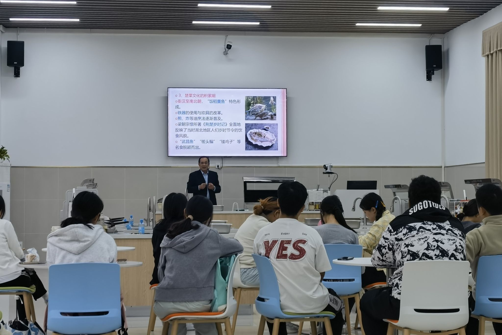 第一堂课围绕湖北饮食文化与热拌菜制作为内容展开,以“理论讲解+示范操作+分组实践”的授课方式进行。在理论讲解部分,邀请了食品科学技术学院谢定源老师为同学们带来中国饮食文化基础知识讲解。谢定源系统展示了中国饮食文化发展历程,分别从饮食文化的概念、中国饮食文化的理论基础、楚菜文化的历史与特点、美食制作基础知识等七个方面进行深入浅出的讲解,阐明了以“味”为核心,以“养”为目的中国饮食的核心理念。他还讲解了中西方人对饮食态度的差异,即西方人采取“科学实用”的态度,中国人则采取“艺术”的态度。