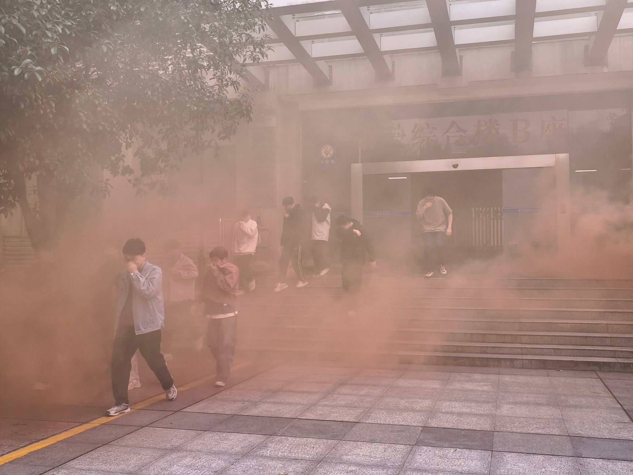 全流程疏散演练模拟真实场景,实现“全过程、全方位”覆盖。11月12日,第一综合楼开展“报警、疏散、救援”全流程演练,师生及工作人员闻声而动,用湿毛巾捂鼻、弯腰低姿沿预定路线撤离,数分钟内全员抵达安全区域。黄青松结合建筑特点强调逃生原则,生命科学技术学院涂立超称,模拟演练有效提升了避险能力。