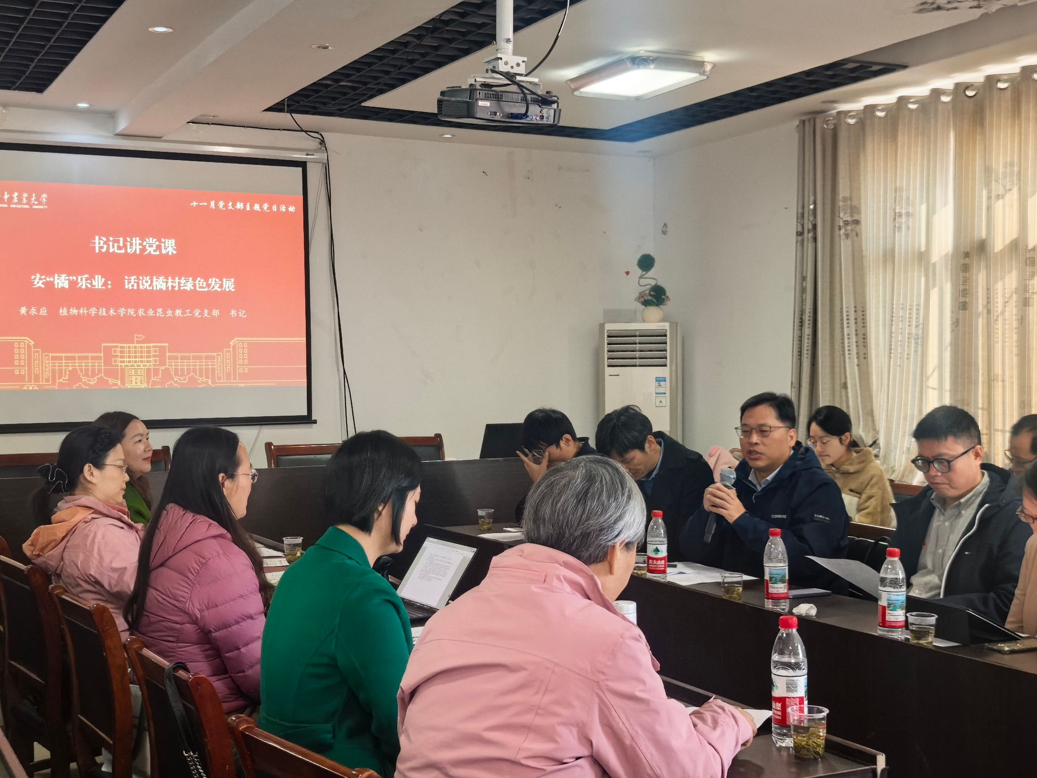 在书记讲党课环节,马克思主义学院教工第三党支部书记李凤兰以“‘橘’想如意:话说橘农美好生活”为题,从中国共产党以人为本的思想出发,探讨了人民美好生活意涵的历史演进、思想引领以及未来展望。植物科学技术学院农业昆虫教工党支部书记黄求应则聚焦“安‘橘’乐业:话说橘村绿色发展”,强调推动柑橘产业与绿色发展相融合,坚守生态底线,实现产业兴、生态美、百姓富的橘乡新图景。