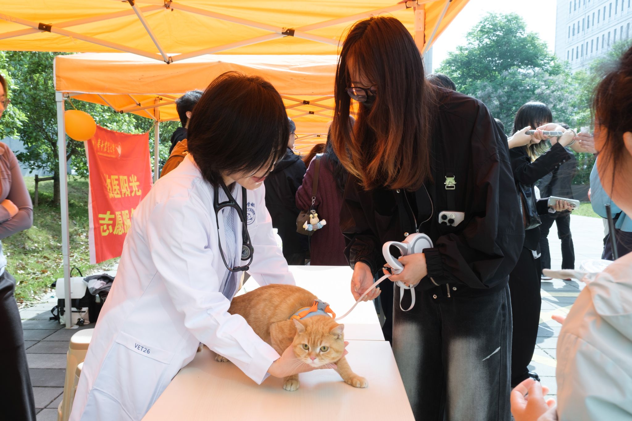 “萌宠互动与义诊”专题活动则涵盖了异宠科普、宠物义诊、宠物毛发爪印DIY等多项内容。异宠科普区现场氛围热烈,蛇、鹦鹉等各类异宠吸引参与者们驻足观看,工作人员细致讲解异宠饲养要点与养护常识,让同学们实现近距离观察学习。宠物义诊区域,志愿者为宠物开展基础健康检查,并结合宠物实际情况给出科学养护指导。动医2503班廖展卉带着两只猫咪参与义诊,她谈到:“志愿者给出的建议专业又细致,为我的猫咪分别提出体重管控、口腔清洁、耳道护理与疫苗接种的注意事项,同时科普了科学的养猫知识,我收获良多。”