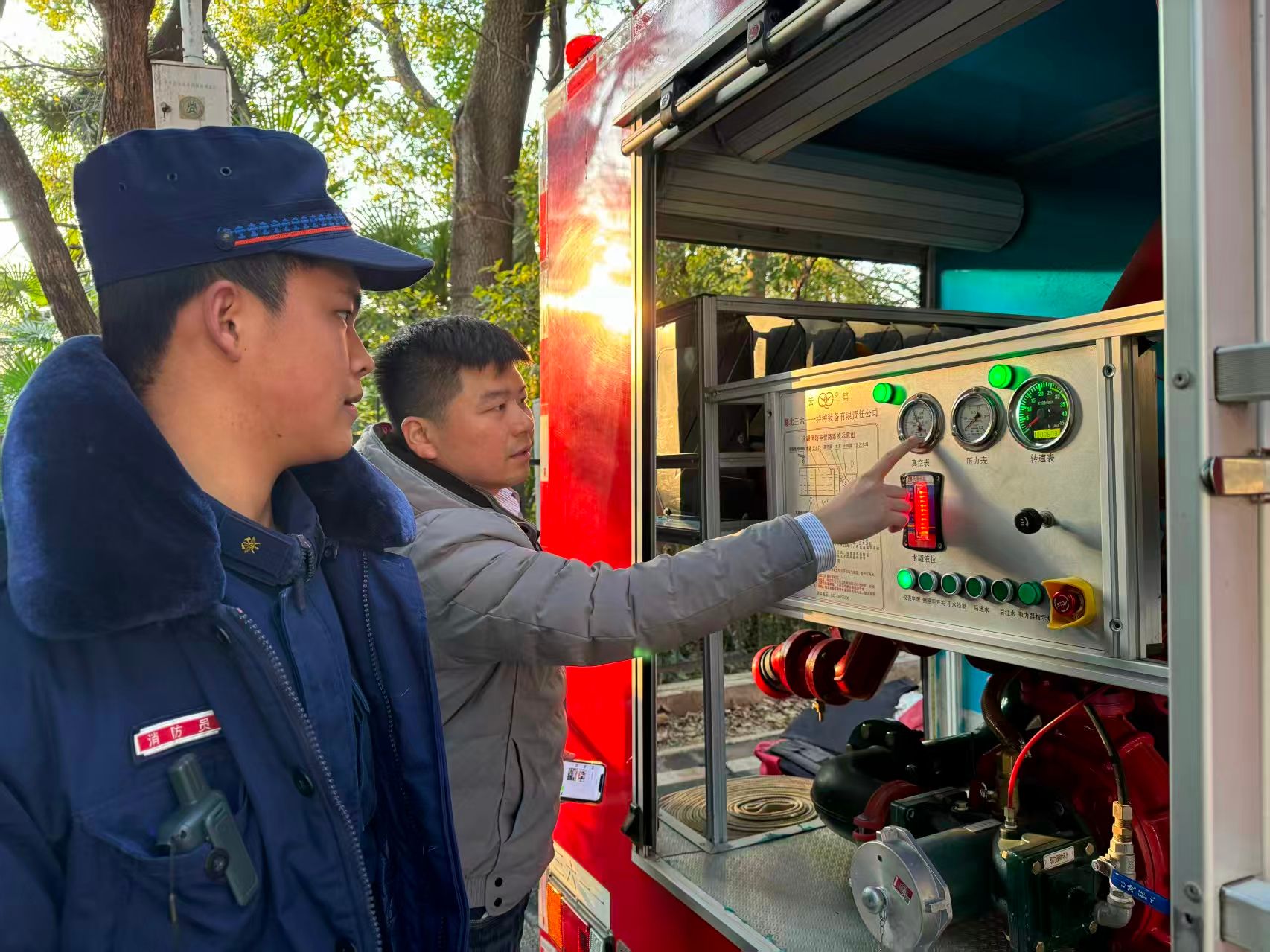 ▲黄远卓在查看消防车水压(校园建设与安全保卫部 供图)
