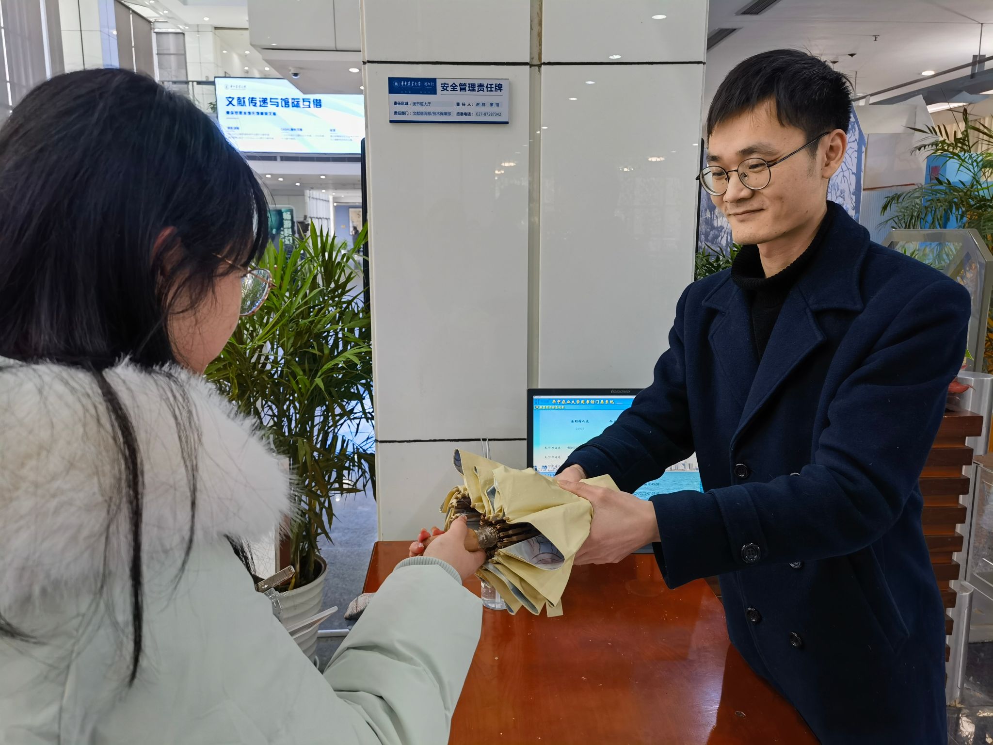 下雨天,图书馆物业管家易超将爱心伞借给同学(以上图片均由 资产经营与后勤保障部 提供)