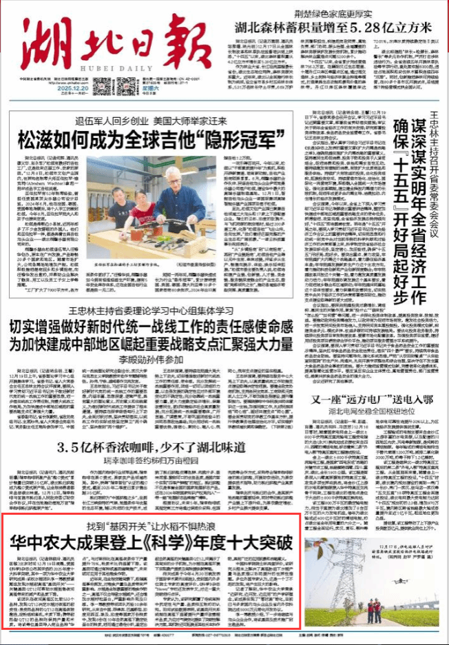 国际权威期刊《科学》杂志今天发布了2025年度十大科学突破,华中农大水稻团队发现的水稻耐高温基因相关研究成果入选。