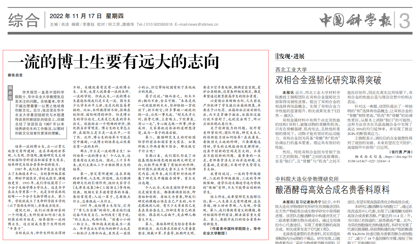 近日,在水稻团队的一次组会上,张启发院士回顾了团队自1987年来培养研究生的工作做法,他强调,培养一流的博士生,应一以贯之地坚定有所建树、追求卓越的世界观、人生观、价值观,激励研究生主动对标国际学…